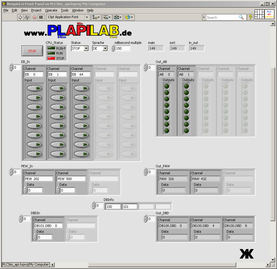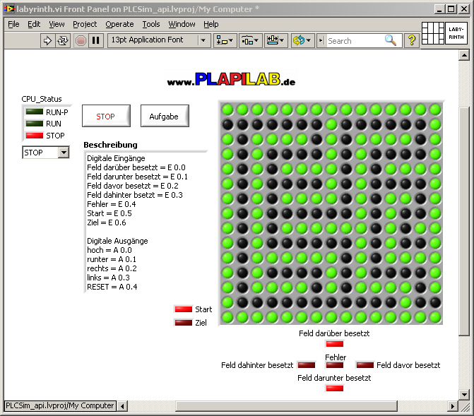 PLAPILAB finden Sie unten als Download. In dem Archiv befinden sich die nötigen VIs, um den PLC Simulator auszulesen. Zustätzlich kann ein Beispiel VI aus dem Howto Video und ein Labyrinth VI, welches man mit Hilfe eines SPS Programmes lösen kann, herunterladen.